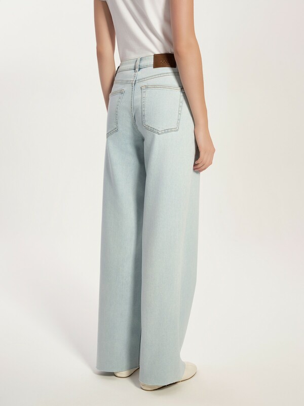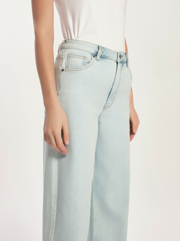 "Длинные широкие джинсы из плотного денима небесно-голубого цвета прекрасно подойдут девушкам любого роста: необработанный срез модели позволяет легко регулировать длину брюк. Благодаря широкому крою брюк и комфортной посадке джинсы не сковывают движения и визуально вытягивают силуэт.
