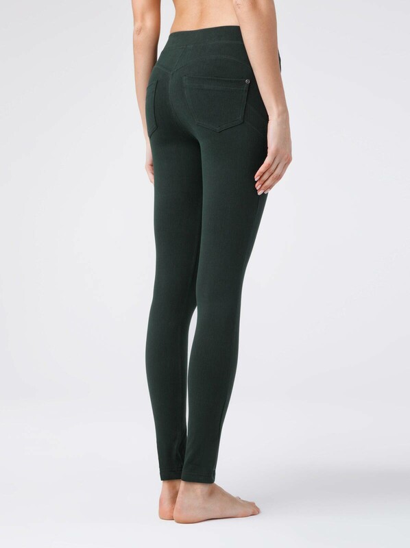 Леггинсы женские облегающие из трикотажного полотна "джинс". По переду изделия-имитация гульфика и боковых карманов. По спинке - фигурные кокетки, 4 боковые вытачки и накладные карманы. Верх изделия обработан поясом с широкой резинкой внутри.