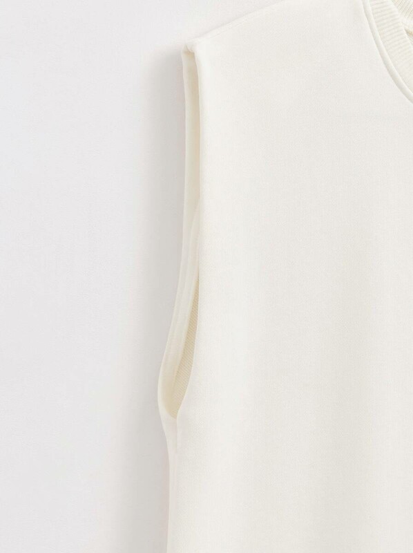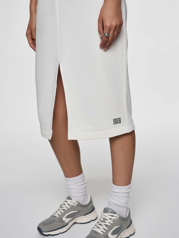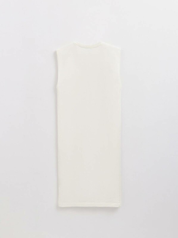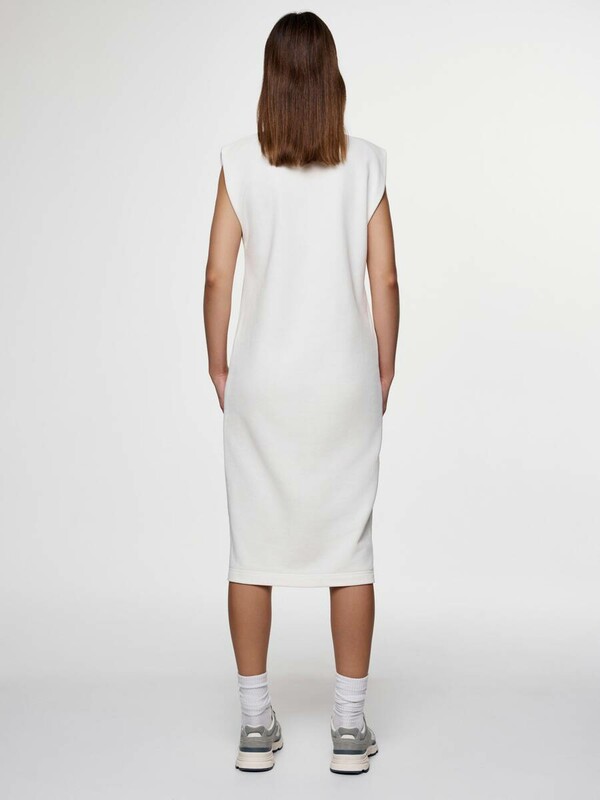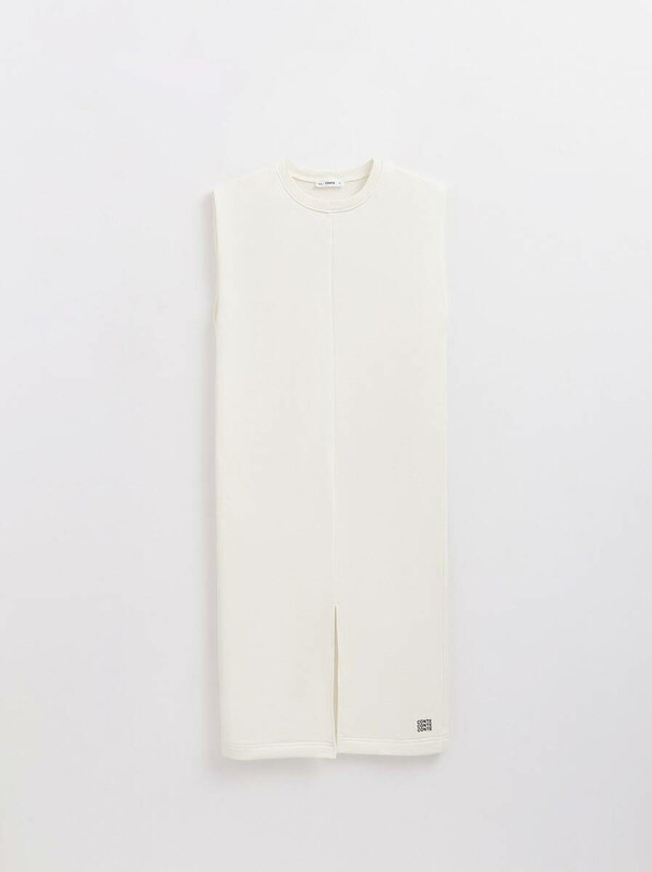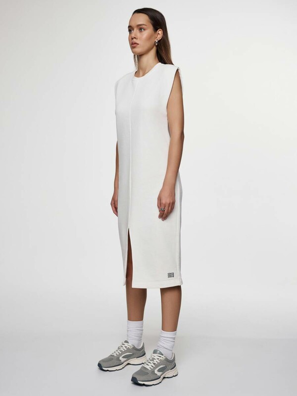 Платье из футера со спущенной линией плеч и разрезом станет основой для множества расслабленных базовых образов, а также может быть стилизовано для умеренно деловых и вечерних аутфитов.