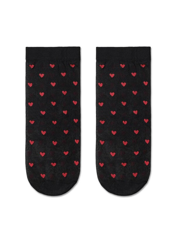 Тонкие фантазийные носки с рисунком «сердечки», выполненном из красной полипропиленовой нити – идеальное дополнение к романтичному образу современной девушки. Носки эластичные, легкие, безупречно облегающие ногу, поэтому в них будет комфортно на протяжении всего дня.