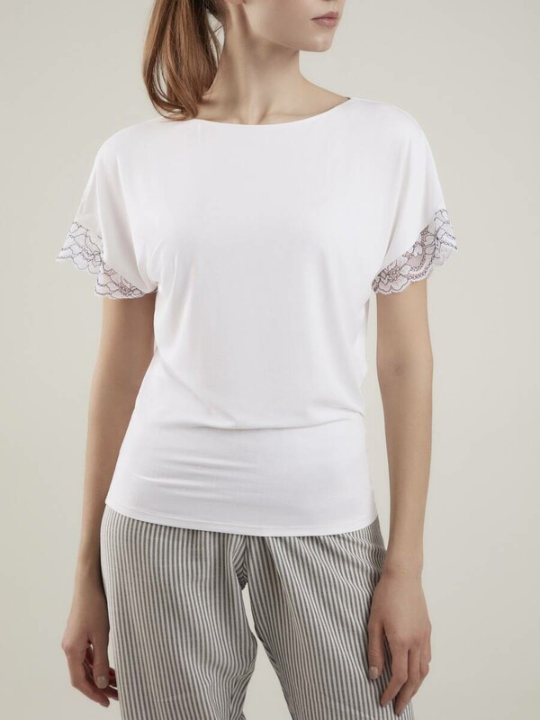 Цветочное кружево, подчеркнутое контрастной рельефной нитью, нежнейшая вискоза и умеренно прилегающая, комфортная посадка по фигуре – футболка Fusion создана для стильных и удобных домашних образов.