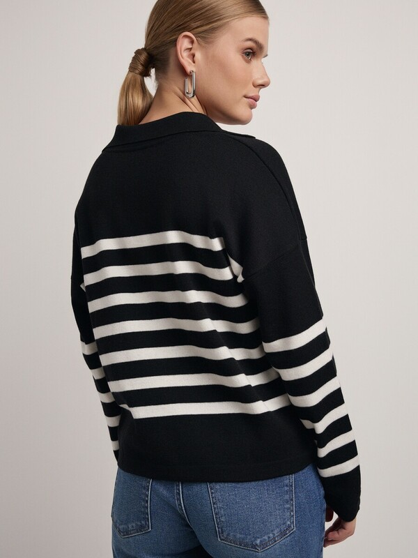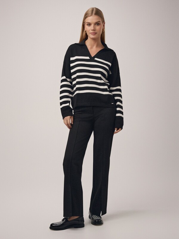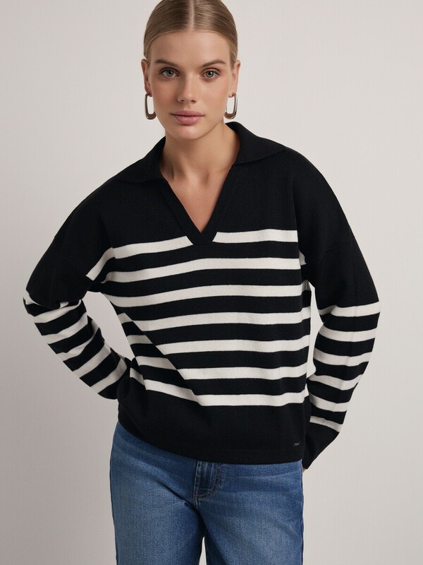 "Джемпер свободного силуэта с V-образным вырезом и отложным воротником-поло поможет создавать множество новых повседневных и офисных образов, не изменяя собственному стилю и комфорту.