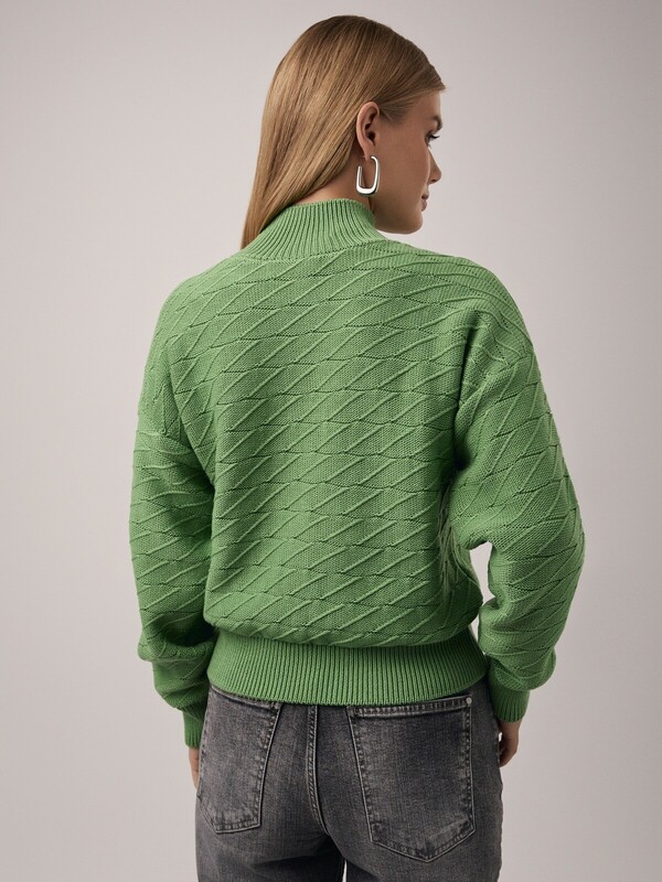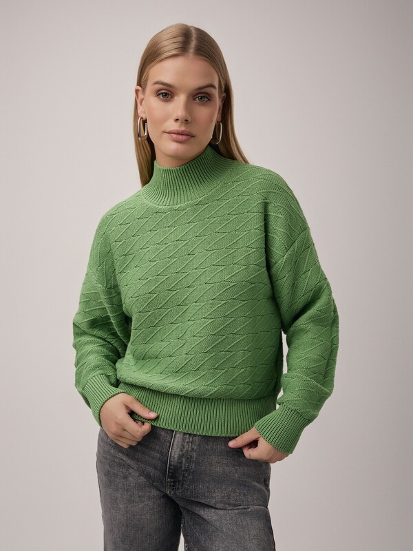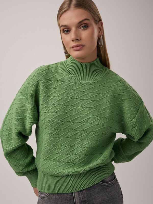"Свитер объемного силуэта с фактурным переплетением сочетается практически со всеми вещами из базового гардероба и подарит вам много уютных моментов благодаря пряже с хлопком.