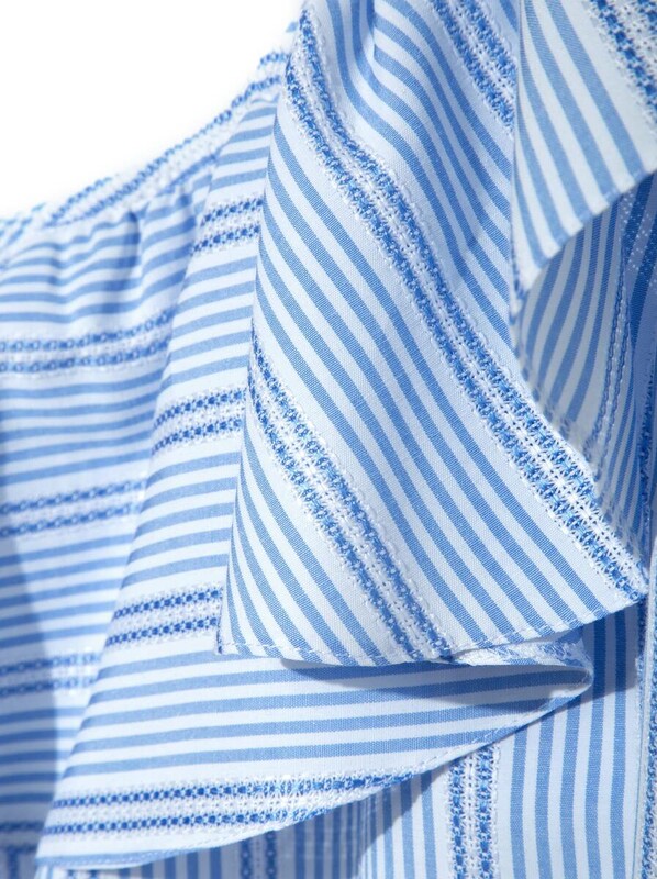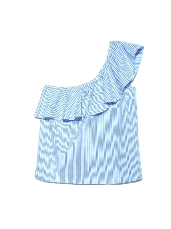 Фактурная блузка на одно плечо - must have в летнем гардеробе девушки. Вы оцените мягкий, полуприлегающий силуэт блузки и трендовую фактурную ткань в полоску с переплетением макраме. Легкость в ваш образ привнесут эластичный волан. Блузка универсальна и прекрасно сочетается с брюками, джинсами, юбками, шортами и леггинсами.