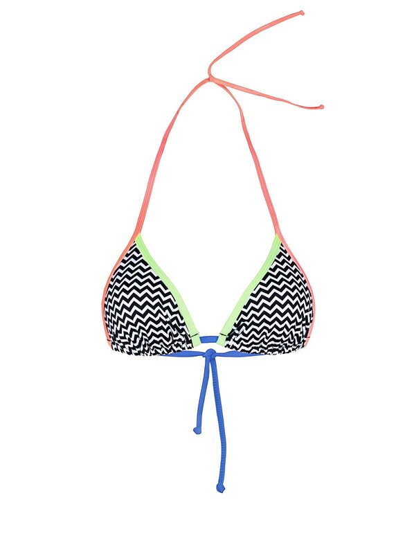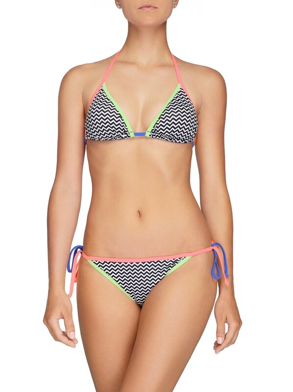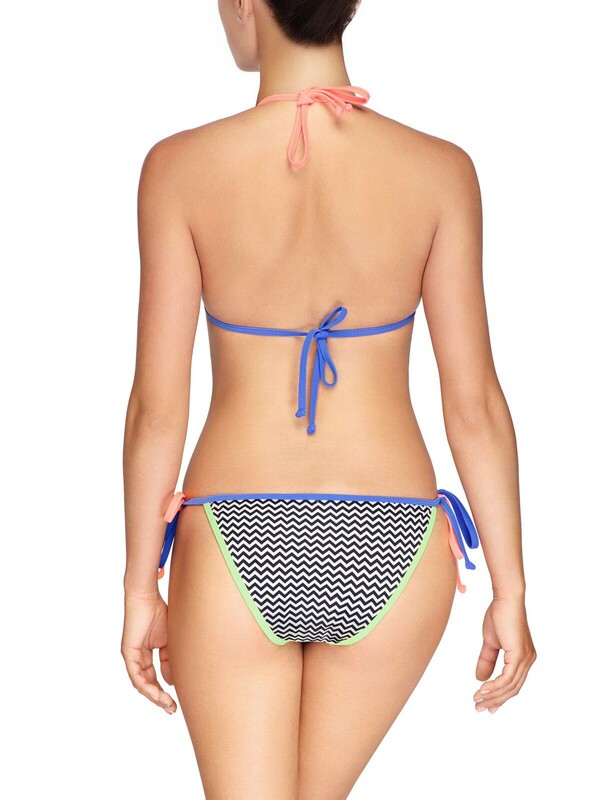 Трусики бикини с завязками на бедрах – классическая пляжная модель. Изюминка этого купальника в сочетании монохромного принта зигзаг и яркой цветной окантовки.