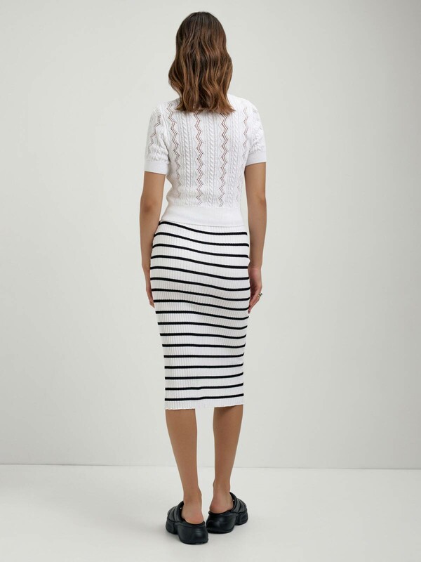 Юбка-midi в полоску в эластичном переплетении ластик LDK 2336Фактурное переплетение ластик со сменой полос, прилегающий силуэт и безупречная посадка по фигуре делают эту юбку особенной частью гардероба, которую вам захочется надевать как можно чаще. Модель изготовлена из тонкой шелковистой пряжи на основе вискозы. PREMIUM VISCOSE: вискоза премиального качества легкая, гладкая, с приятным матовым блеском. Вязаный трикотаж с вискозой приятно холодит, а небольшое количество полиэстра в составе помогает ей сохранять форму. Пряжа устойчива к разрывам, образованию катышек, усадке. · высокая посадка на талии· пояс с эластичной тесьмой· длина midi· прилегающий силуэт· гладкая и приятная к телу пряжа с вискозой· фактурное переплетение ластик со сменой полос· сохранение формы и цвета при соблюдении рекомендаций по уходу· лаконично, женственно и элегантно· создайте total-look, используя джемпер LDK 2335.