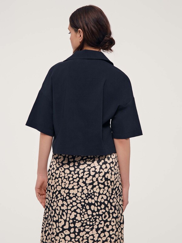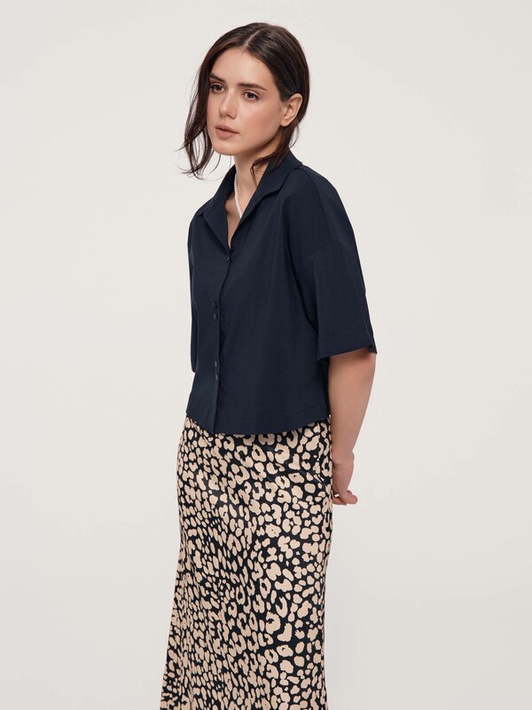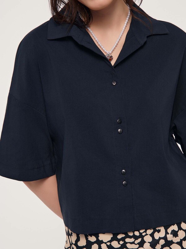 Лаконичный дизайн, свободный крой и абсолютный комфорт благодаря полотну с хлопком – эта рубашка имеет все шансы стать самой любимой частью гардероба для теплого сезона. · укороченная модель· умеренно свободный крой· отложной воротник с цельнокроеной стойкой· короткие втачные рукава· застежка на пуговицы по планке · мягкое и приятное к телу хлопковое полотно· устойчивый цвет и сохранение формы при соблюдении рекомендаций по уходу· выполнена в лучших традициях минимализма.