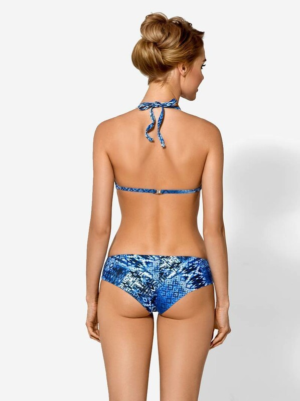 Лиф купального костюма с жесткой формованной чашкой и драпировкой по низу. Фиксируется завязками спагетти за шею и застежкой по спине. Трусы купальные «СЛИП» с низкой линией талии, задняя половинка двойная.Трусики широкие по бедрам в размере XL, в размере S,M,L более узкие по бедрам и открытые по попе.