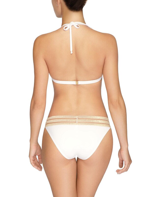 Трусики слип с отделкой из декоративной золотой резинки. Средняя линия талии позволяет трусикам отлично смотреться на девушках с любым типом фигуры.