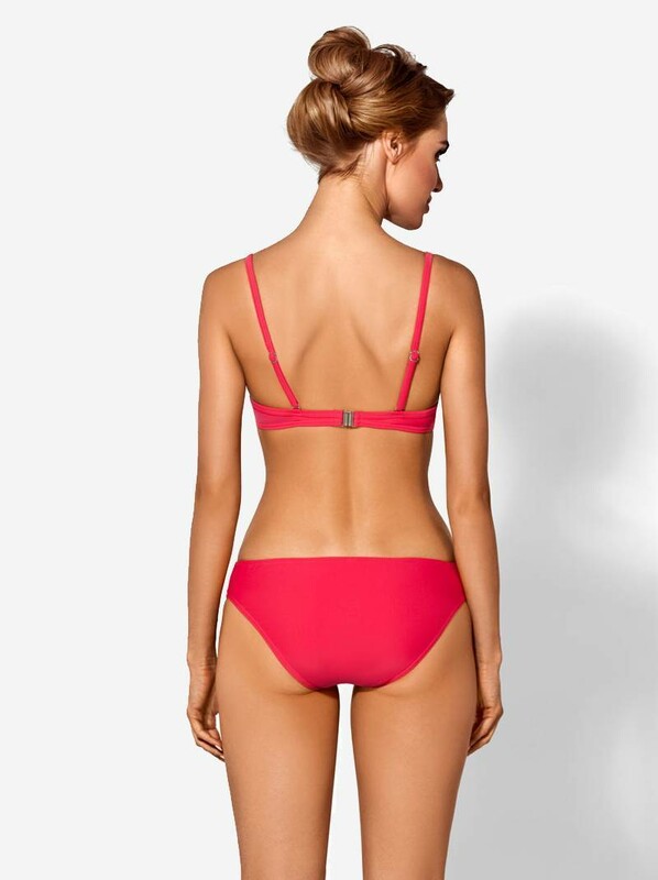 Лиф купального костюма с жесткой формованной чашкой «PUSH-UP» на каркасах, оформлен шнуром контрастного цвета и декоративным украшением по ластовице. Фиксируется регулируемой бретелью и застежкой по спине.Трусы купальные «СЛИП» с низкой линией талии из эластичного трикотажного полотна.