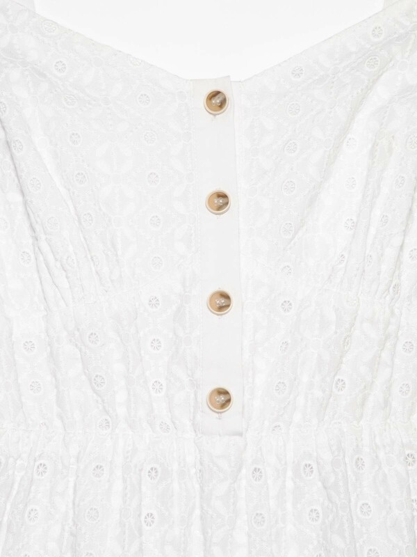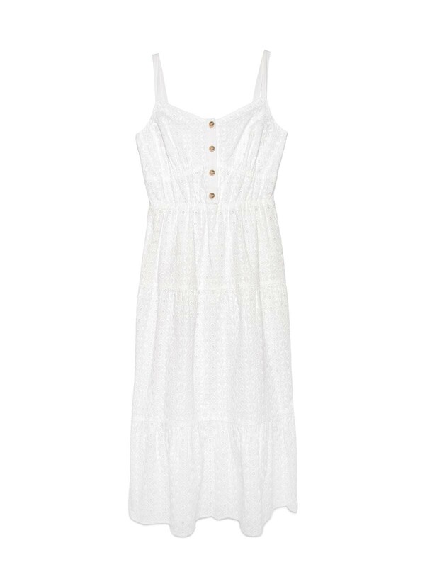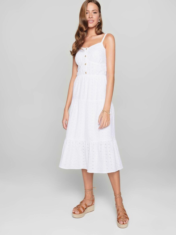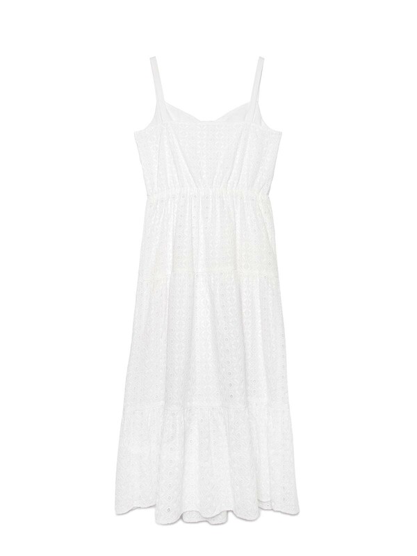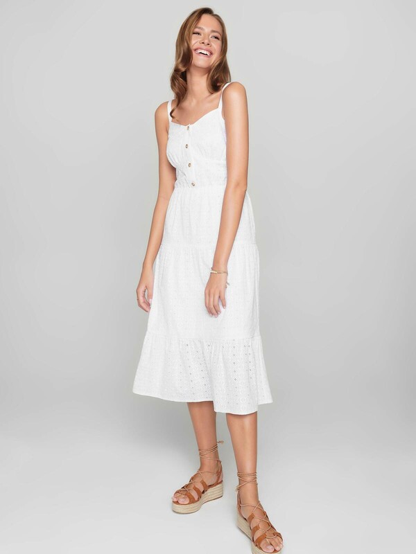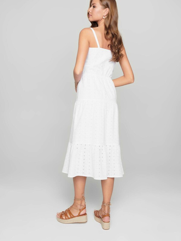 Легкое платье на тонких бретелях из хлопка премиального качества поможет создать оригинальный образ и подарит абсолютный комфорт даже в самый жаркий день. PREMIUM COTTON: хлопок премиального качества мягкий, приятный к телу и «дышащий». · без рукавов· на подкладке· длина midi· тонкие бретели по плечам· планка с застежкой на 4 пуговицы· акцент на талии с помощью эластичной тесьмы· юбка А-силуэта из трех воланов, сшитых между собой· ультракомфортное ажурное полотно с вырезами и вышивкой ришелье· хлопок премиального качества· сохранение формы и цвета при соблюдении рекомендаций по уходу· легко и изящно.