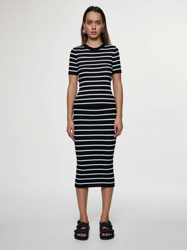 Юбка-midi в полоску в эластичном переплетении ластик LDK 2336Фактурное переплетение ластик со сменой полос, прилегающий силуэт и безупречная посадка по фигуре делают эту юбку особенной частью гардероба, которую вам захочется надевать как можно чаще. Модель изготовлена из тонкой шелковистой пряжи на основе вискозы. PREMIUM VISCOSE: вискоза премиального качества легкая, гладкая, с приятным матовым блеском. Вязаный трикотаж с вискозой приятно холодит, а небольшое количество полиэстра в составе помогает ей сохранять форму. Пряжа устойчива к разрывам, образованию катышек, усадке. · высокая посадка на талии· пояс с эластичной тесьмой· длина midi· прилегающий силуэт· гладкая и приятная к телу пряжа с вискозой· фактурное переплетение ластик со сменой полос· сохранение формы и цвета при соблюдении рекомендаций по уходу· лаконично, женственно и элегантно· создайте total-look, используя джемпер LDK 2335.