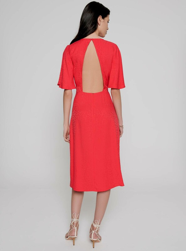 Красное платье-миди из вискозы высочайшего качества с глубоким фигурным вырезом на спинке – то, что нужно для эффектного выхода в свет. Платье подчеркивает талию и визуально моделирует силуэт. SILK TOUCH VISCOSE: премиальная вискоза «Ощущение шелка» подарит мягкость и комфорт на протяжении всего дня. · круглый вырез горловины· горловина и вырез спинки обработаны окантовкой· спинка с глубоким фигурным вырезом· midi· короткий рукав с широкими рюшами по краю· прилегающий крой по груди и у талии, свободная юбка· пришивной пояс фигурной формы со сборкой по лифу· моделирующий эффект· застежка по горловине спинки на одну пуговицу· потайная молния· Silk touch viscose· упругое и эластичное полотно из вискозы высочайшего качества· атласный блеск и леопардовый узор· сохранение формы и цвета при соблюдении рекомендаций по уходу· для тех, кто хочет быть в центре внимания!