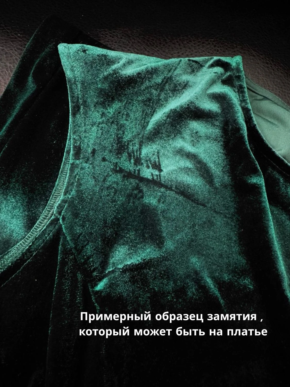 Цвет: Зеленый Застежка: Нет Состав: 95% полиэстер, 5% эластан Ткань: Бархат БРАК: Незначительный дефект ткани -  замятие ворса на  бархате. Возможны другие незначительные дефекты. Вечернее платье прилегающего силуэта, выполненное из нежнейшего бархата. По переду изделия на линии талии складки, визуально формирующие силуэт. По переду изделия высокий разрез.