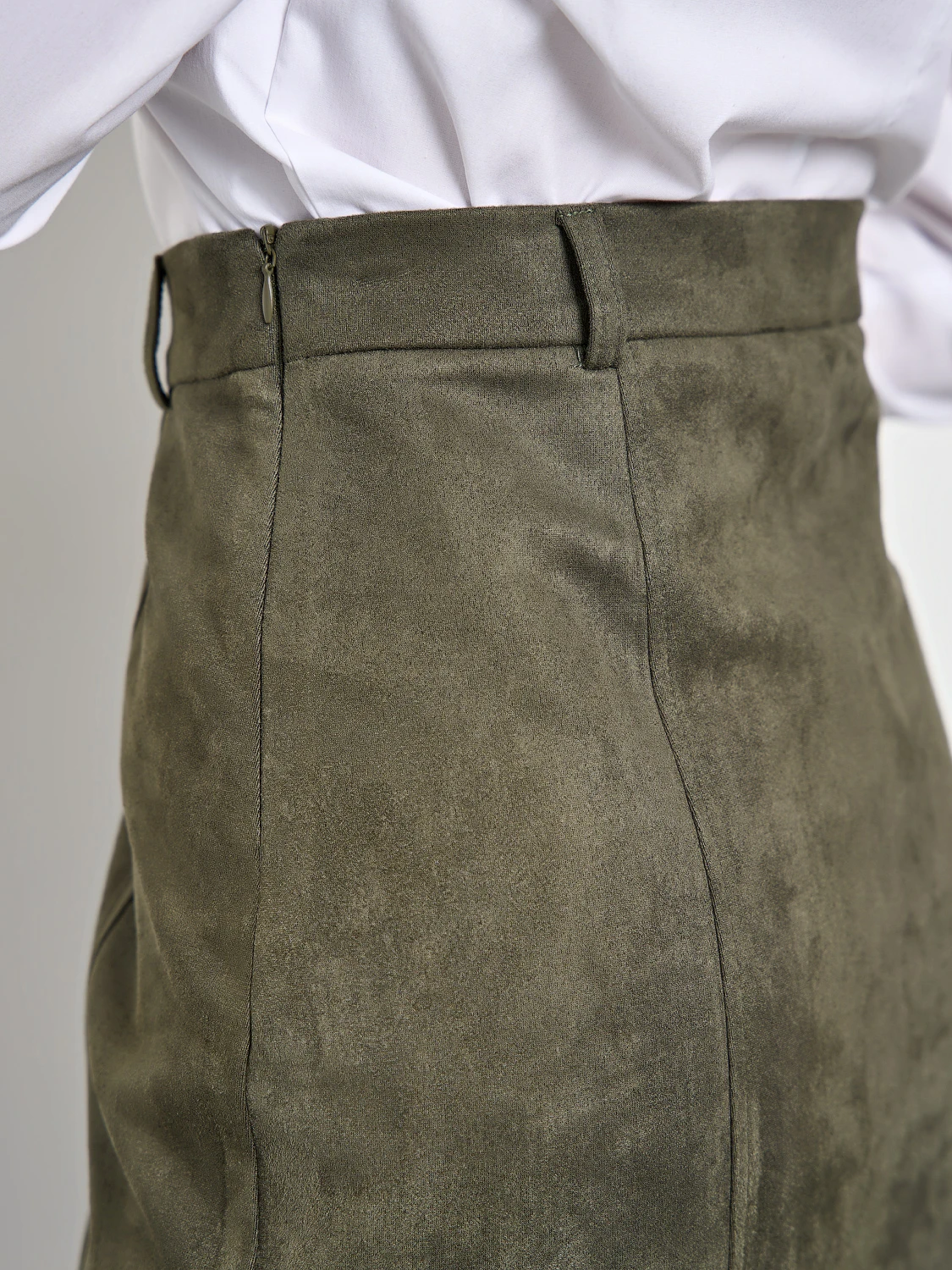 Цвет: Хаки Застежка: Потайная молния Состав: 95% полиэстер, 5% эластан Ткань: Искусственная замша Подкладка: есть Юбка из эко-замши на притачном поясе. Притачной пояс оснащен петлями для ремня. По переду изделия декоративные горизонтальные швы с отстрочкой. В боковом шве потайная молния.