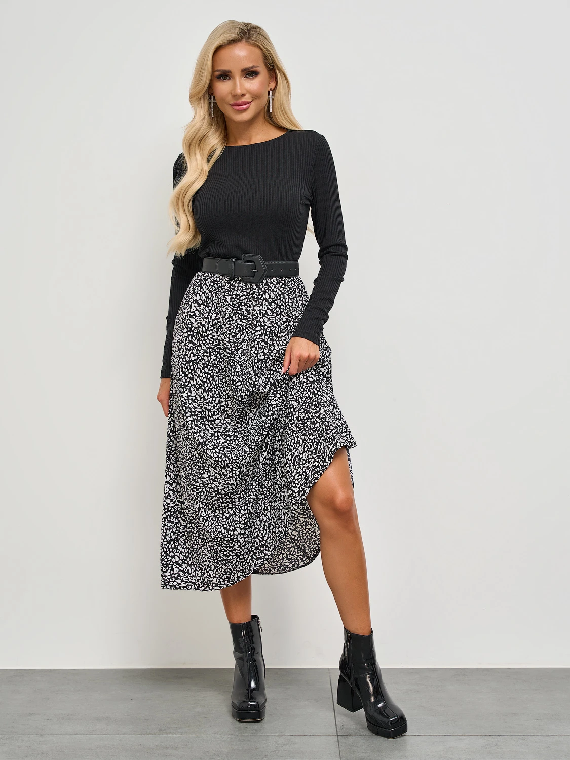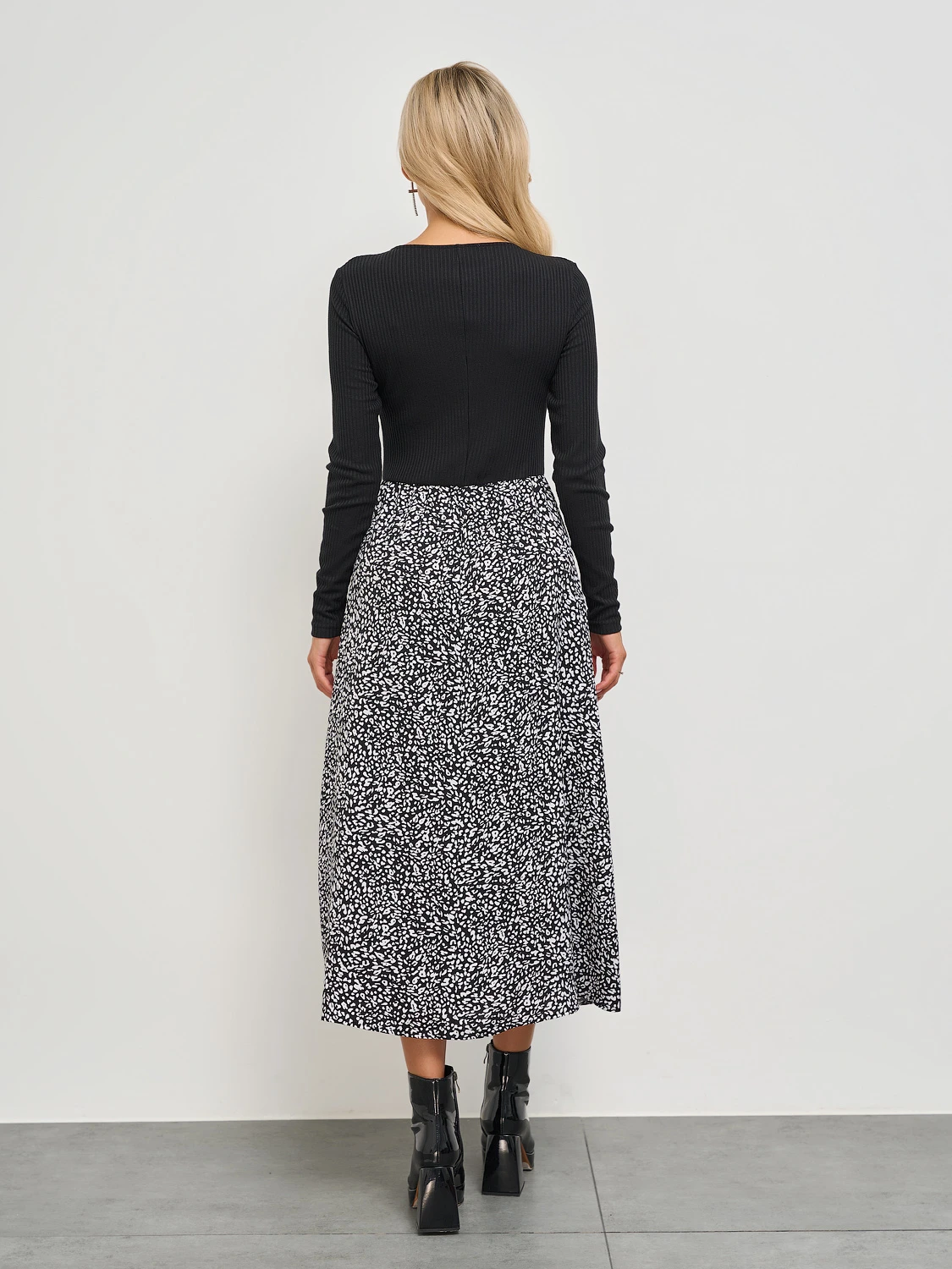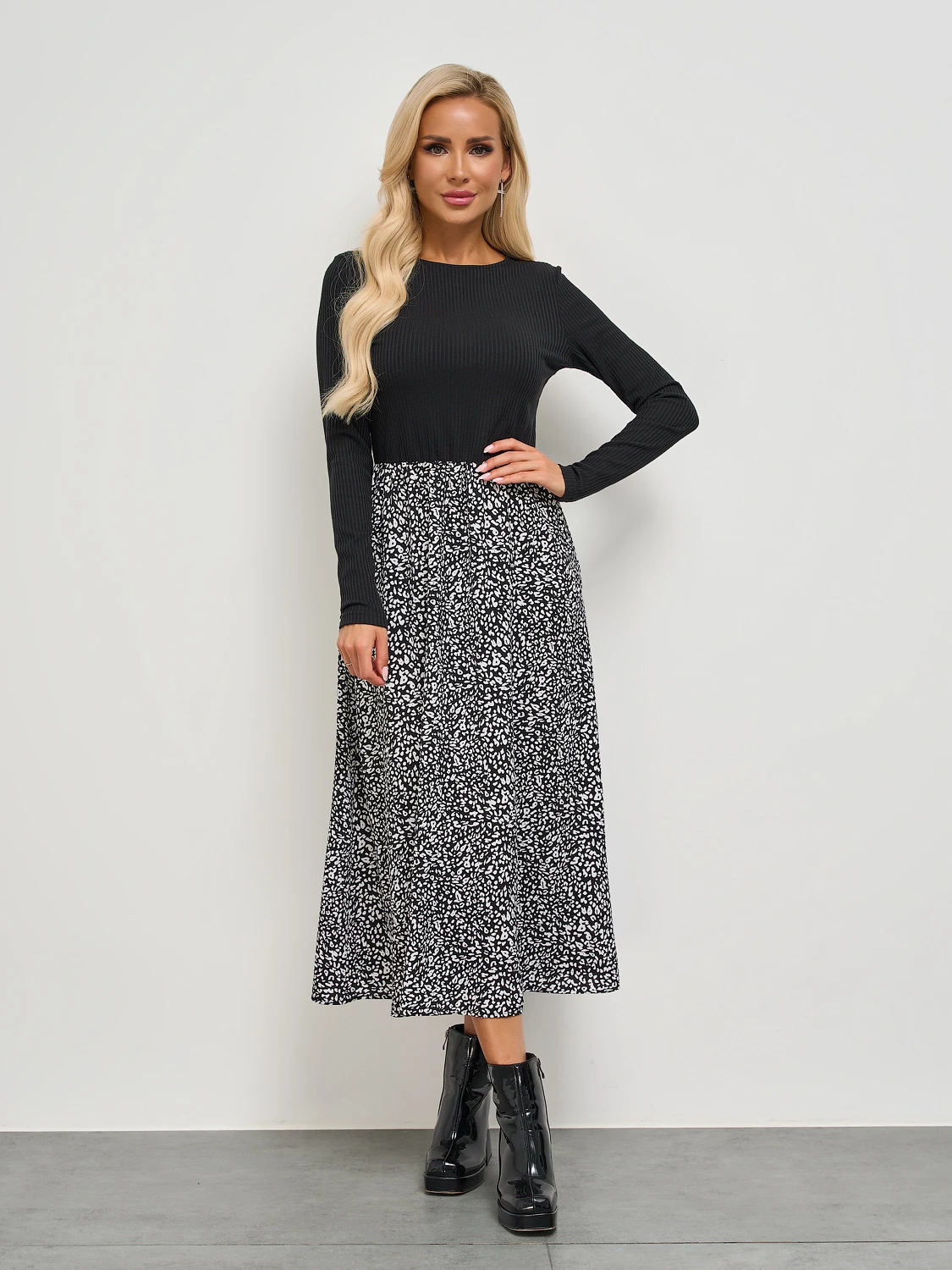 Цвет: Черный,белый Застежка: Нет Состав: 95% вискоза, 5%эластан Ткань: Трикотаж Платье отрезное по линии талии длины миди с длинным рукавом. Верх платья из трикотажа лапша. Низ платья выполнен из плательной ткани.