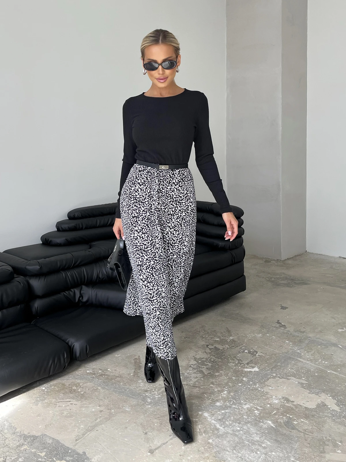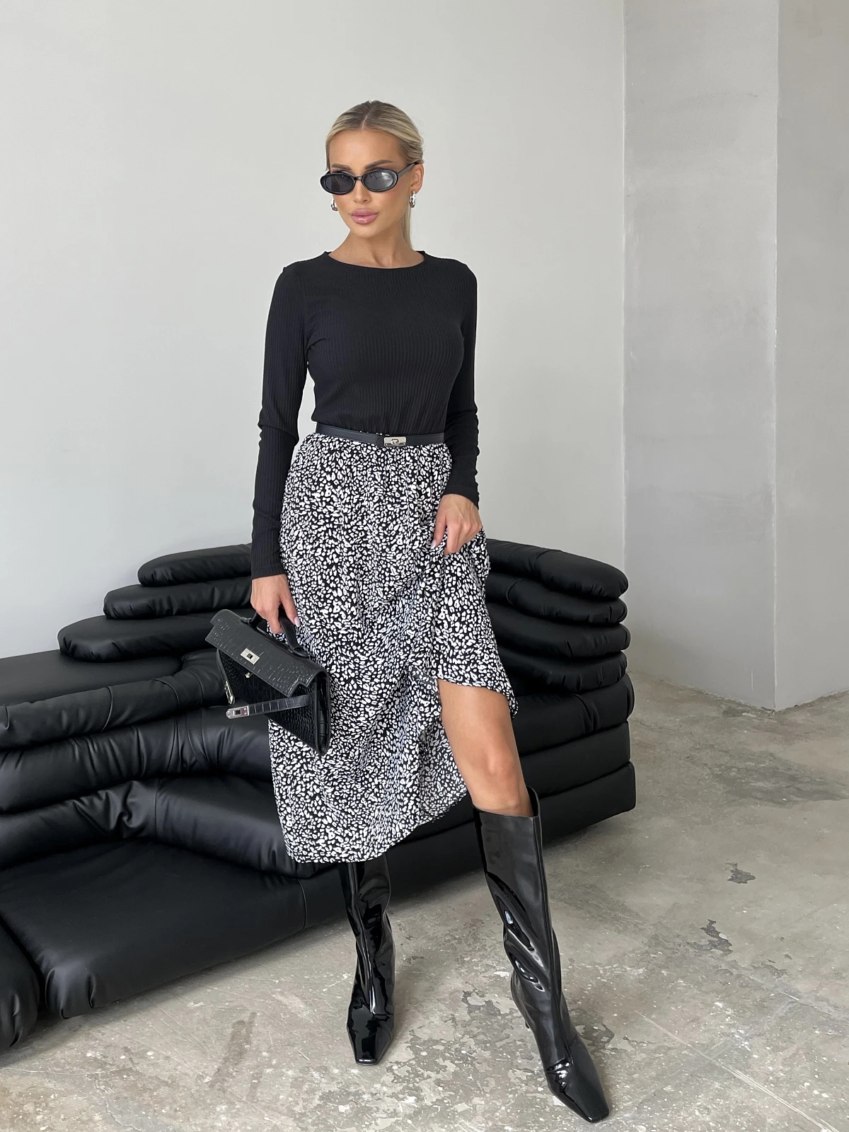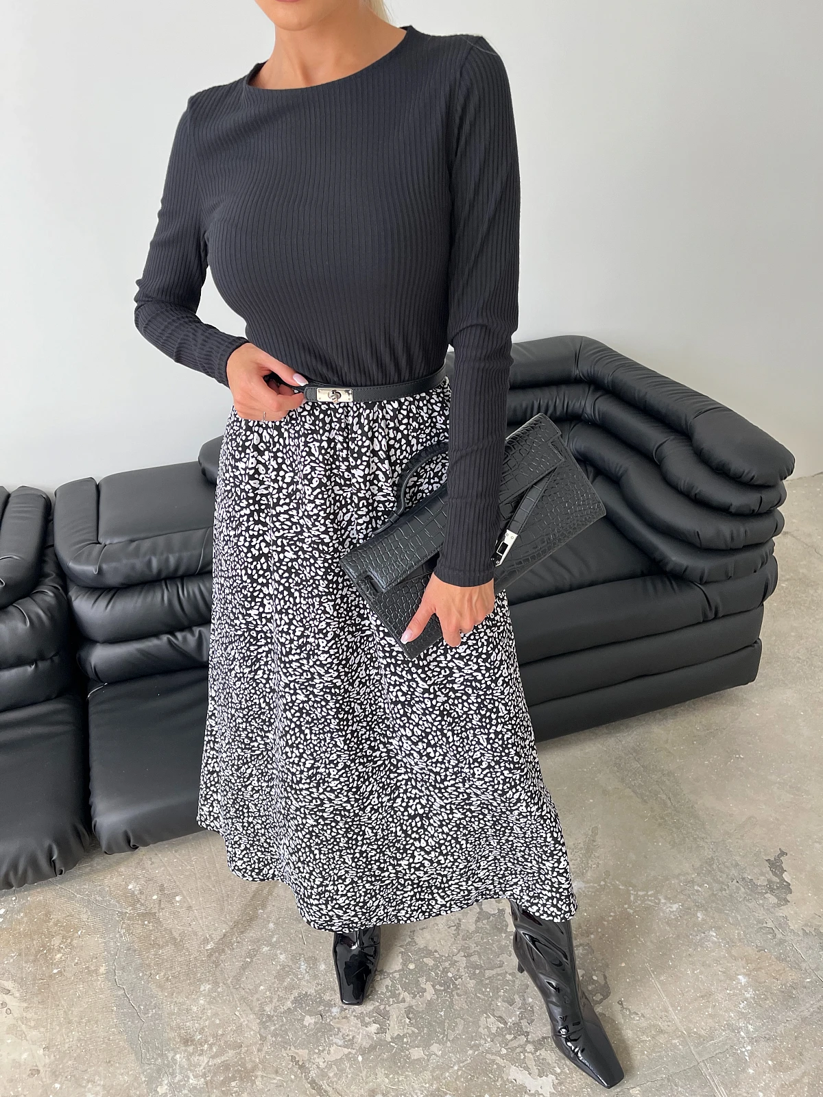 Цвет: Черный,белый Застежка: Нет Состав: 95% вискоза, 5%эластан Ткань: Трикотаж Платье отрезное по линии талии длины миди с длинным рукавом. Верх платья из трикотажа лапша. Низ платья выполнен из плательной ткани.