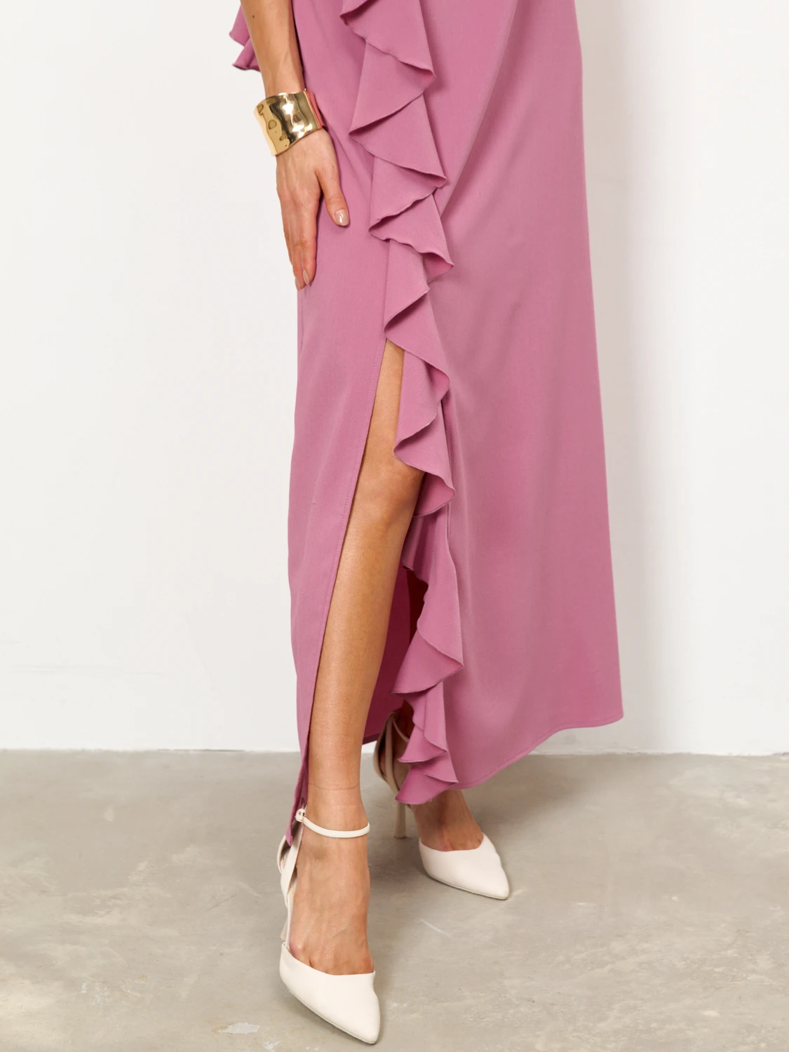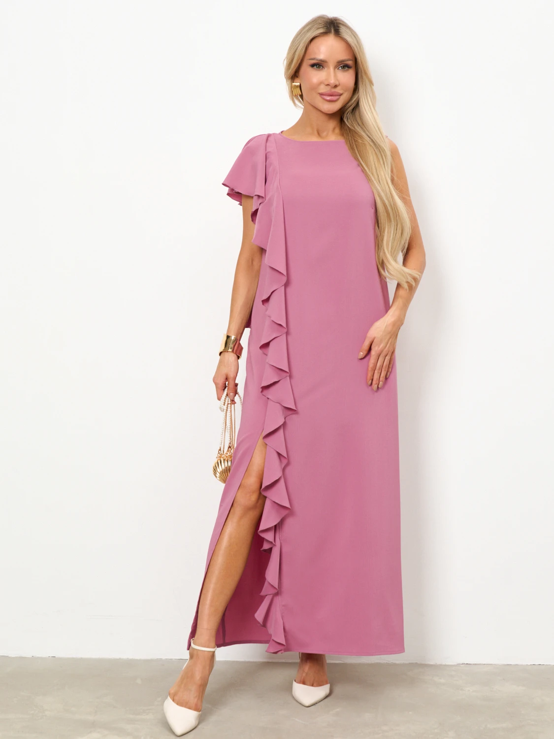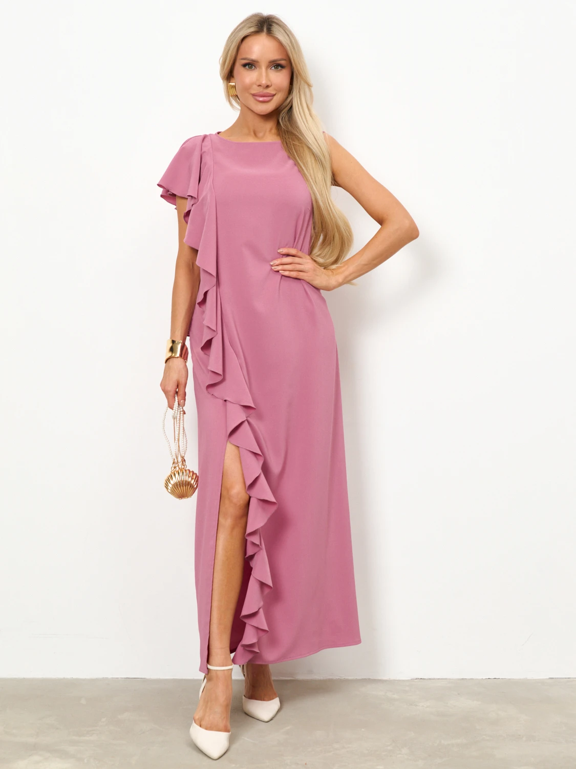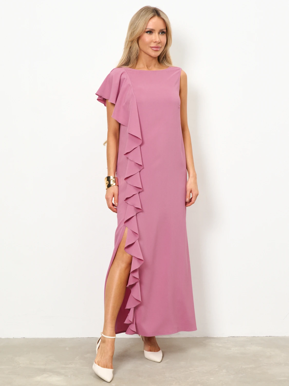 Перед и спинка с одной стороны изделия декорированы пришивным воланом, который мягко ложится на плечо и имитирует рукав.