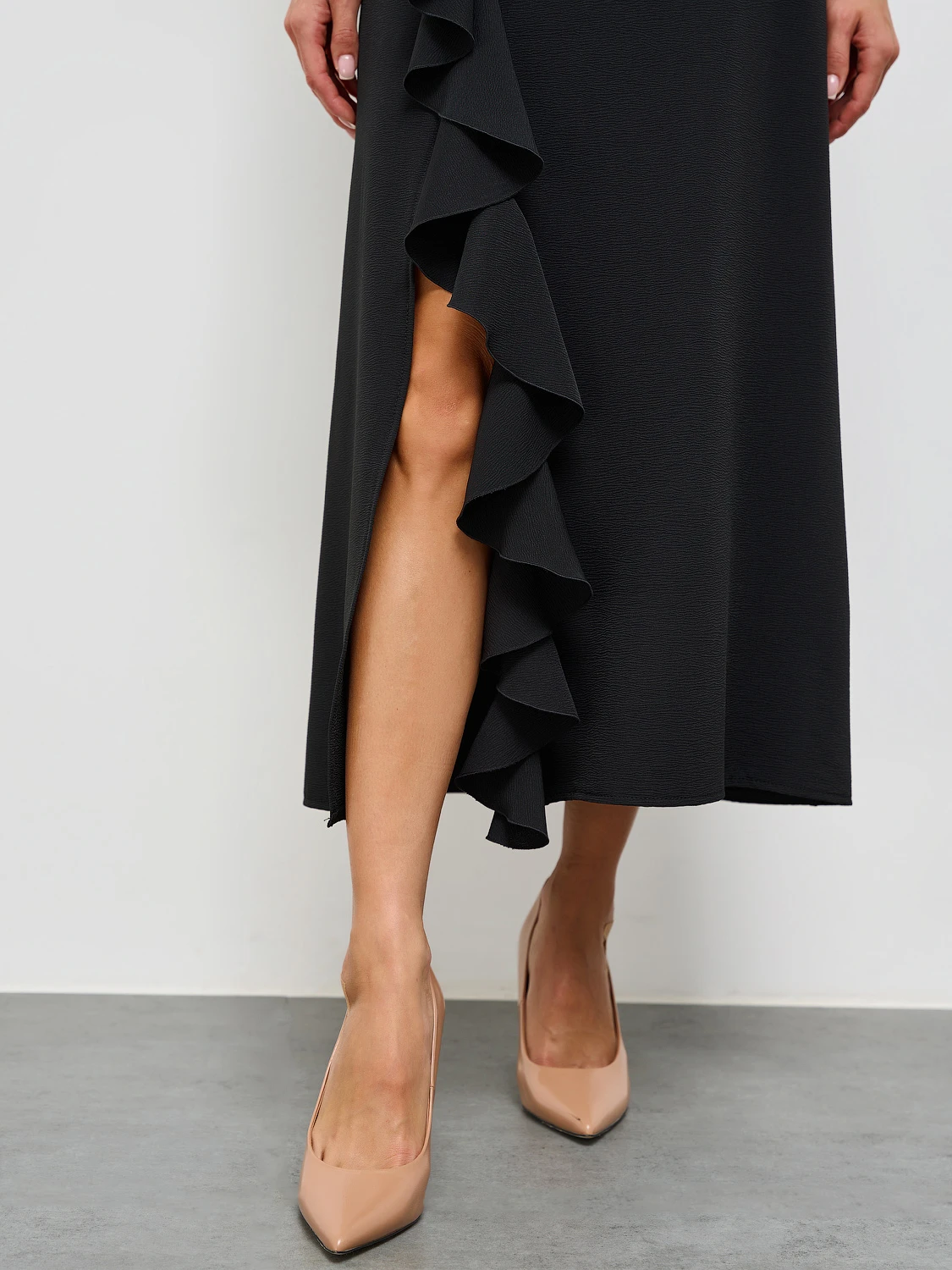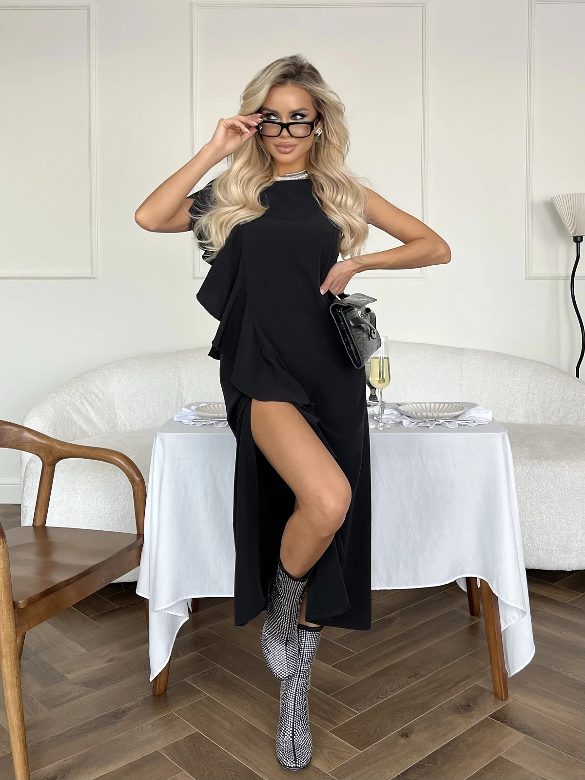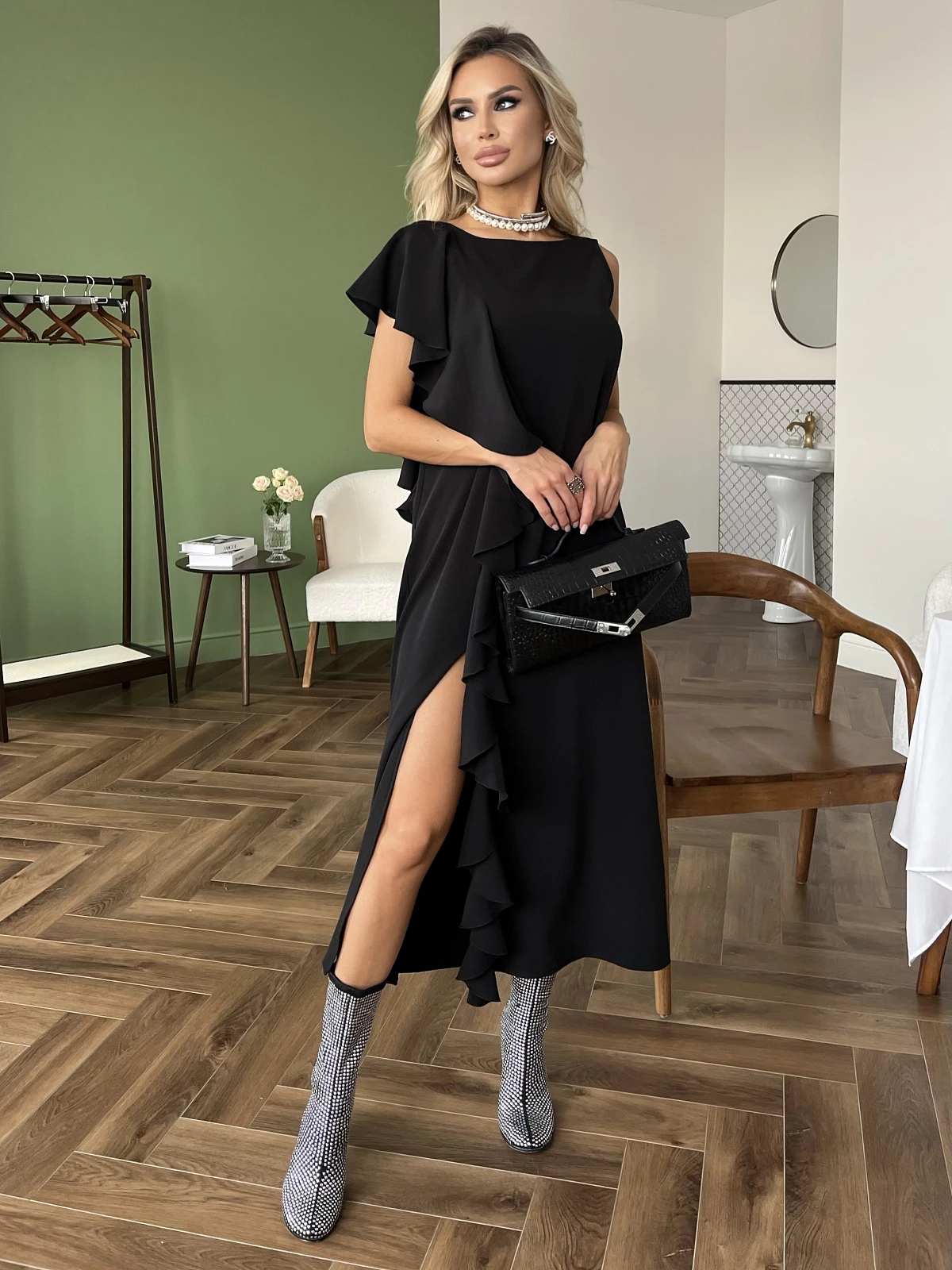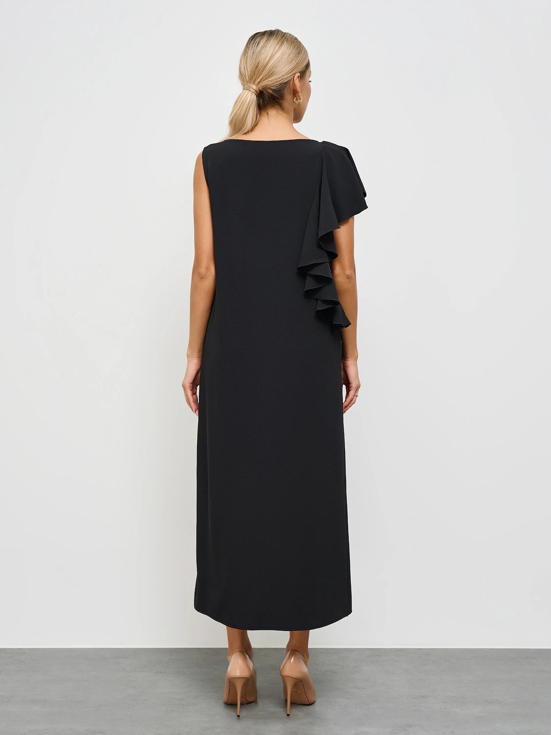 Перед и спинка с одной стороны изделия декорированы пришивным воланом, который мягко ложится на плечо и имитирует рукав.