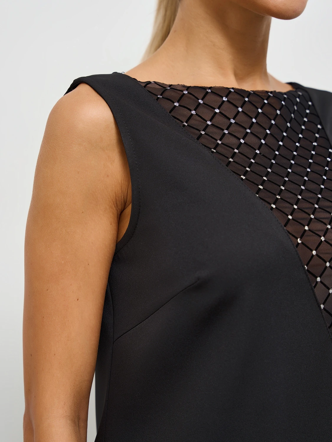 V-образный вырез горловины декорирован сеткой с блестками.