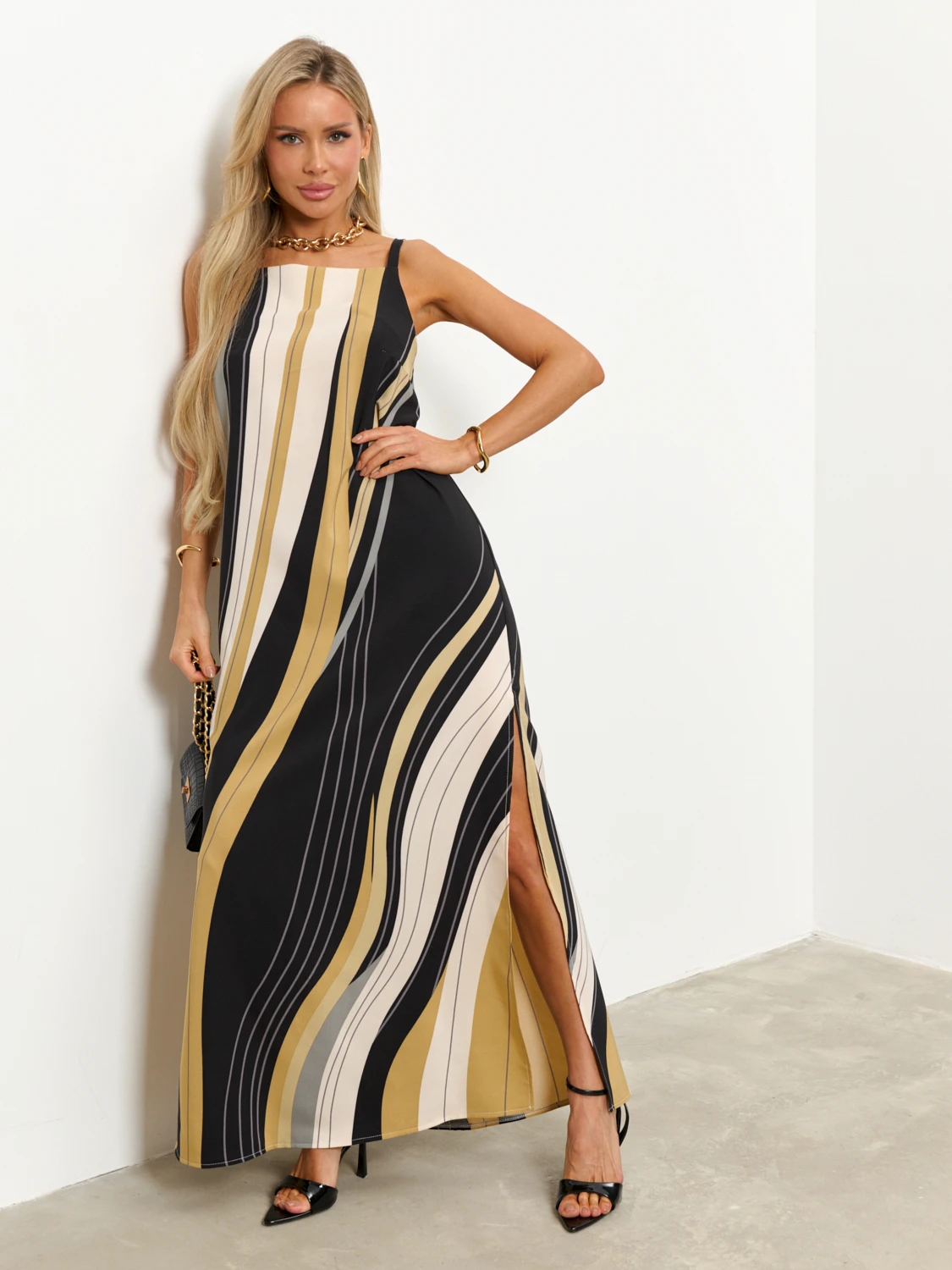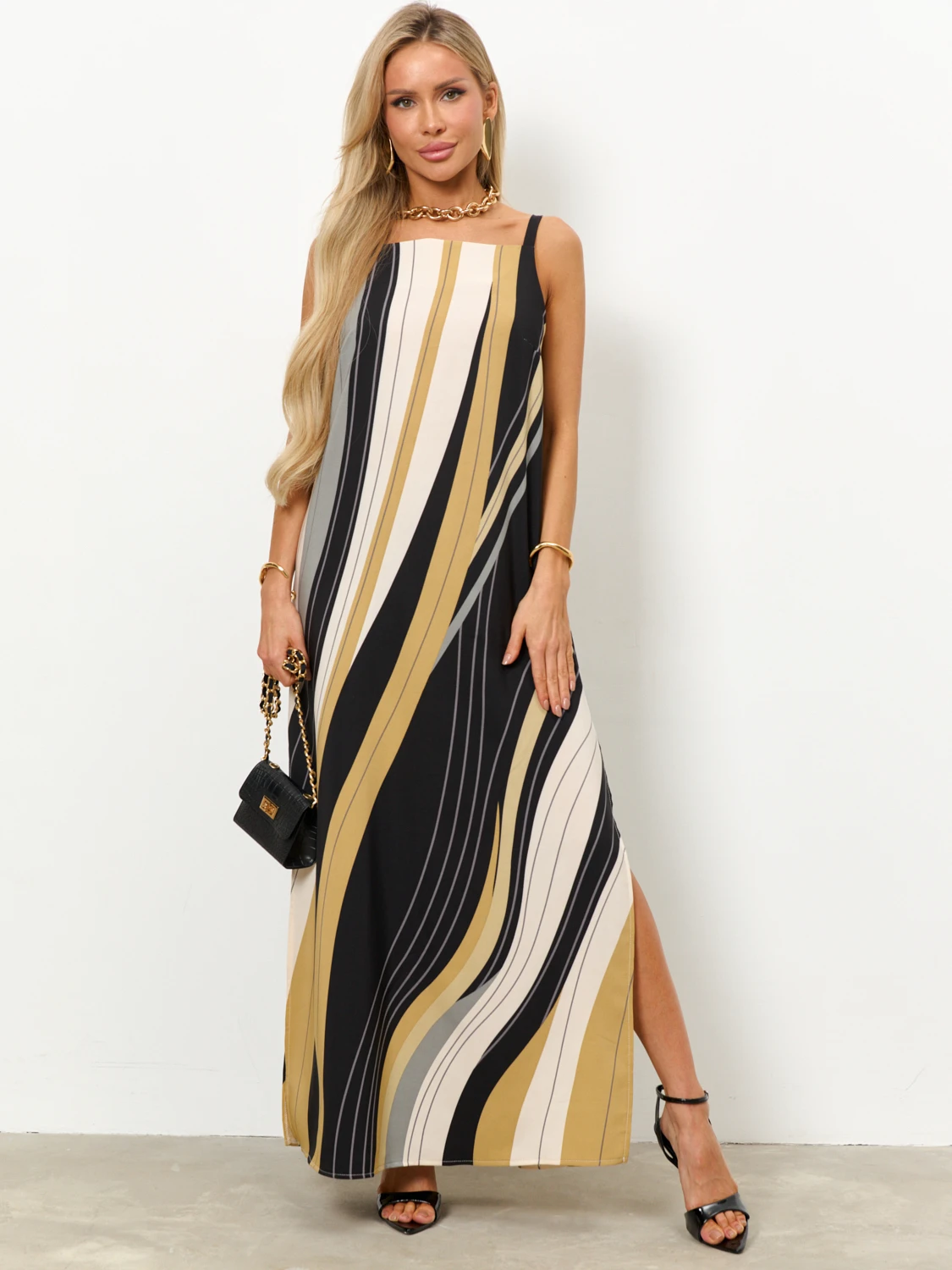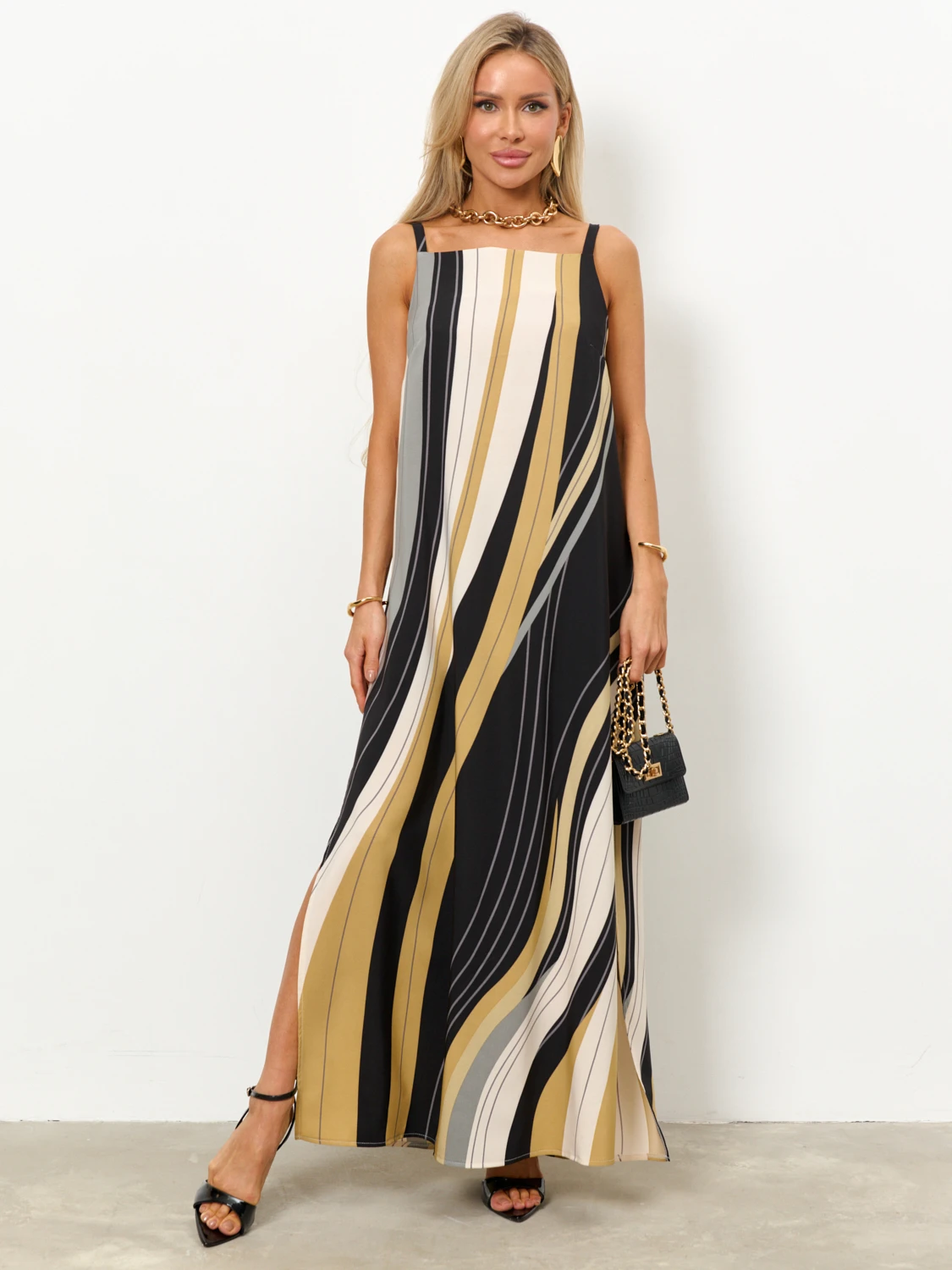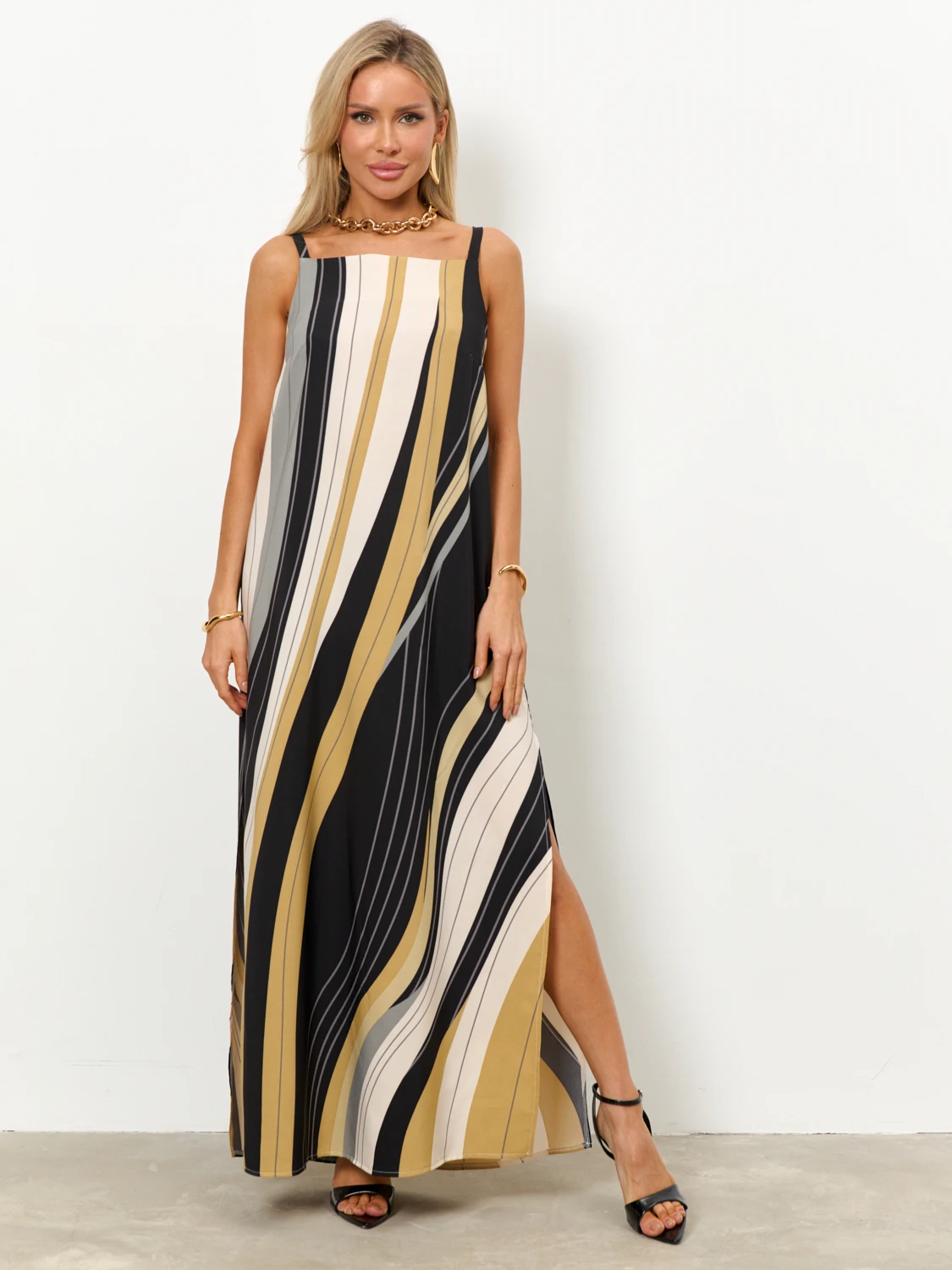 Сарафан прямого кроя на бретелях.