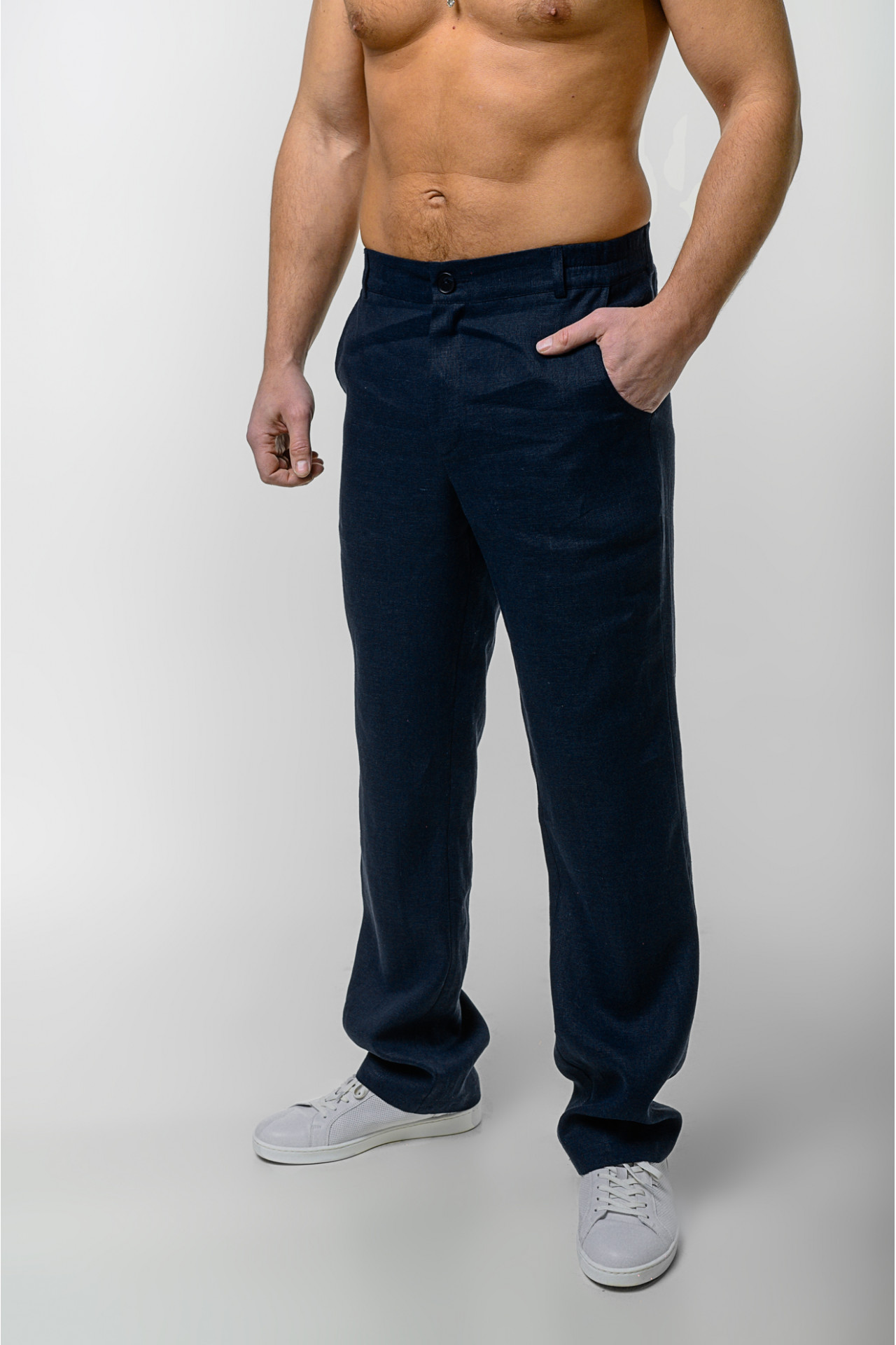 Льняные мужские брюки. Имеют классический крой и среднее облегание по ноге. На задней части имитация кармана «в рамку». На передних частях брюк 2 боковых кармана. Пояс на резинке, для более плотного прилегания.