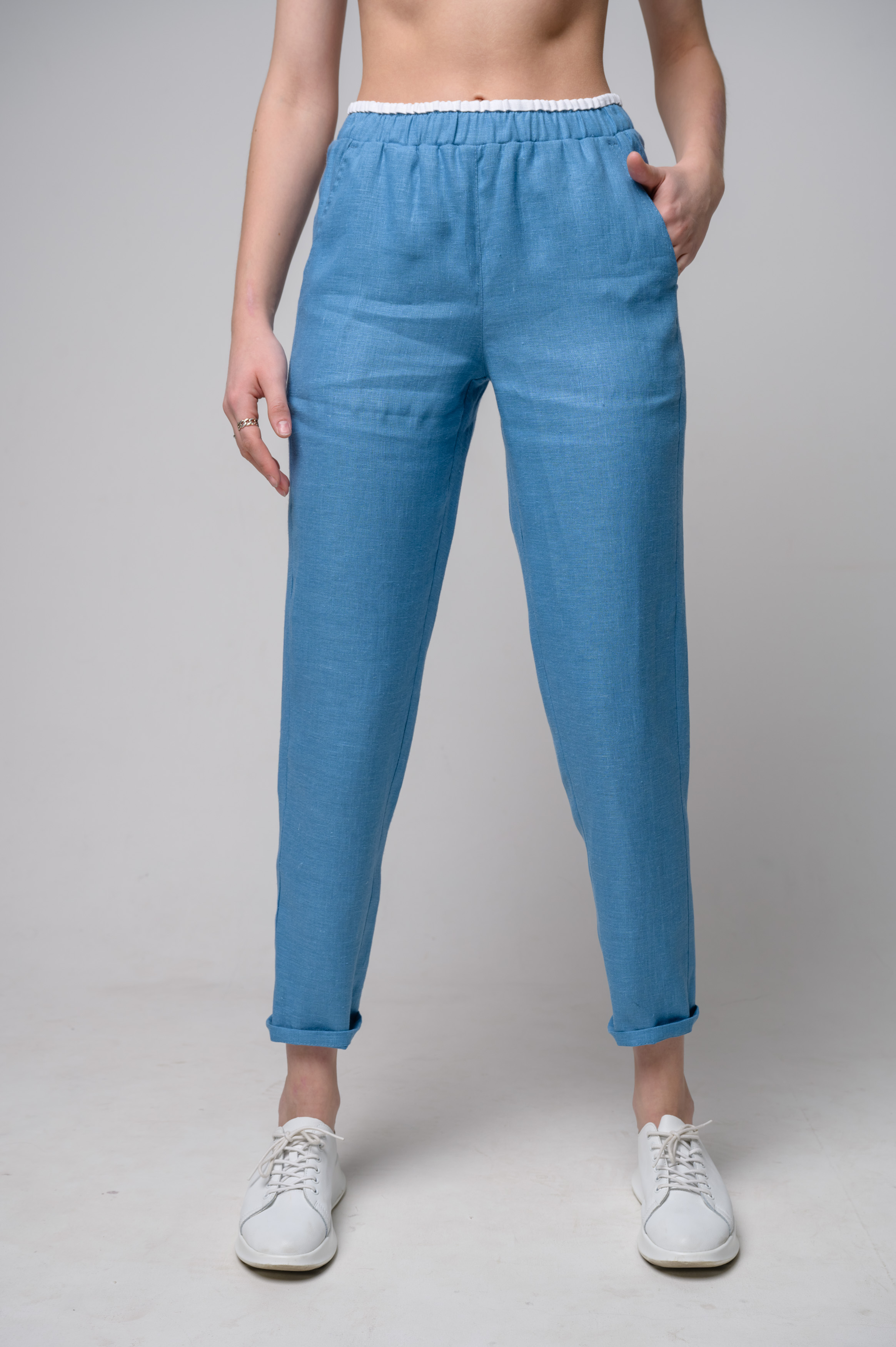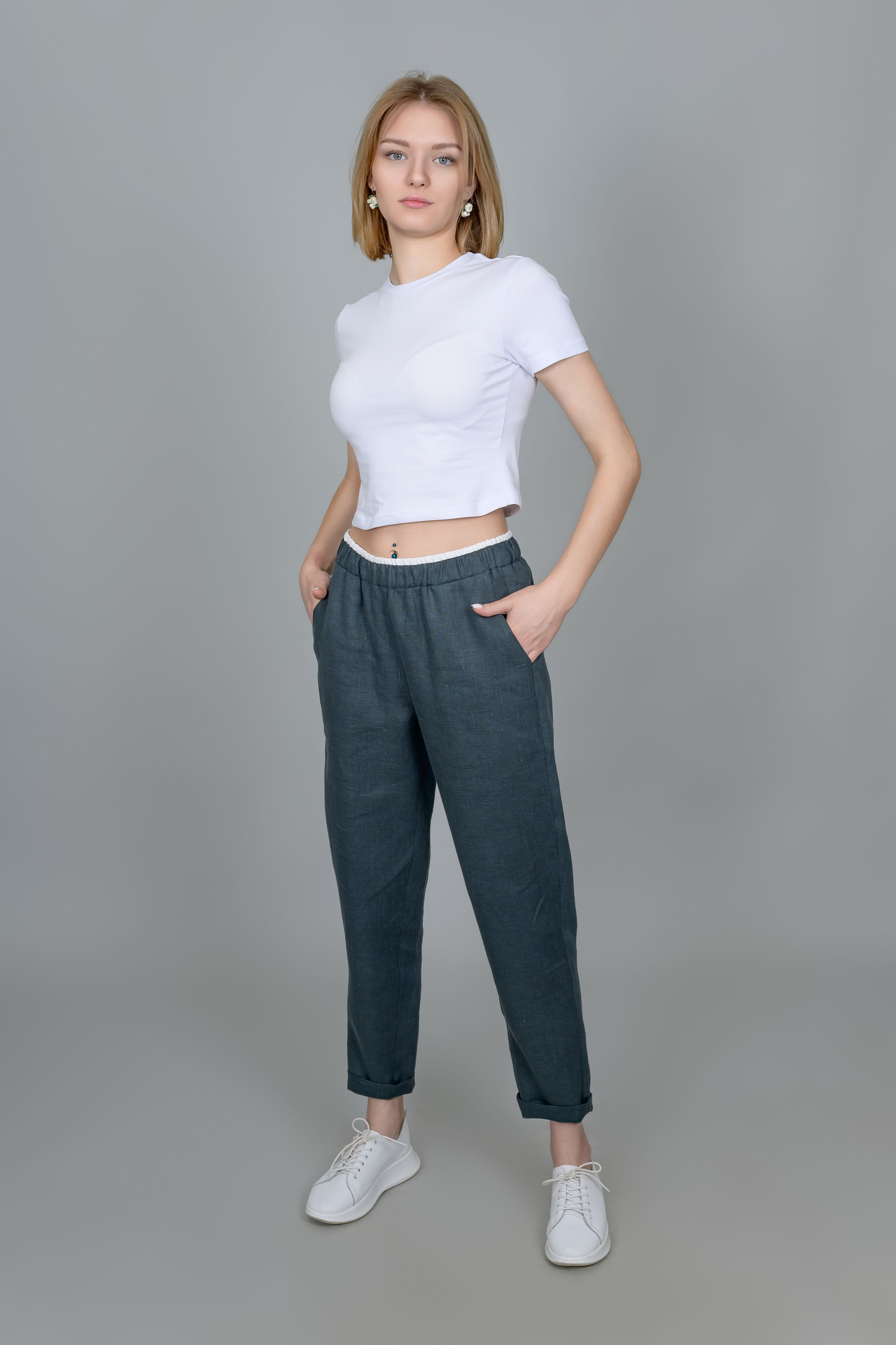 Эти удобные льняные брюки, зауженные к низу, имеют длину 7/8, что делает их универсальными на рост от 156- 174 см. По переду имеются 2 боковых кармана, по задней половинке имитация кармана «в рамку». Широкая резинка плотно и комфортно фиксирует изделие по линии талии.