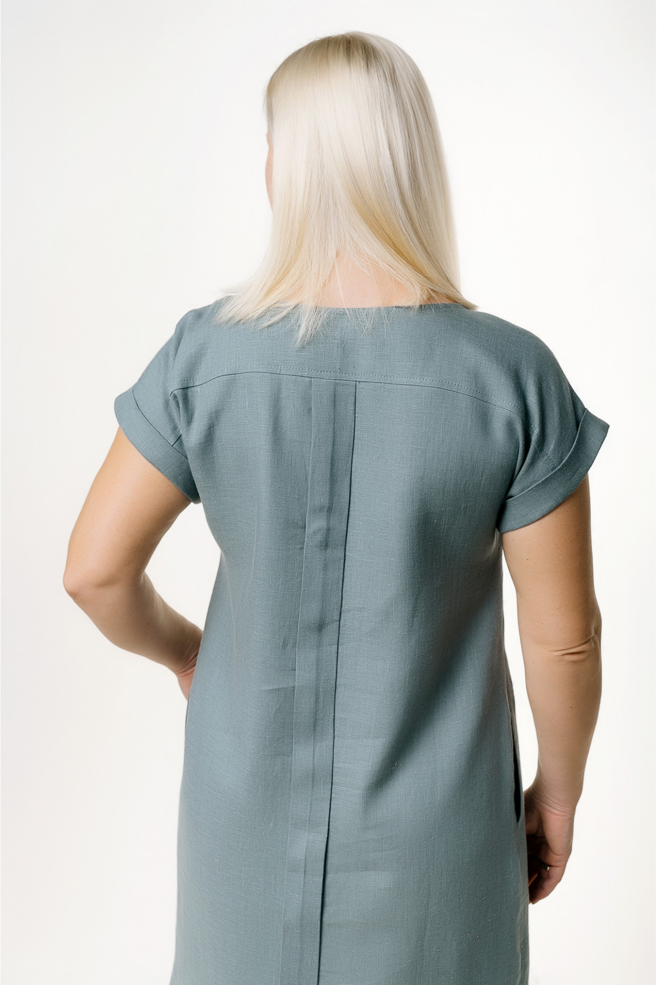 На уровне кокетки застежка на крупную деревянную пуговицу. Средний шов спинки декорирован планкой. Низ изделия выстеган параллельными строчками. По бокам имеются 2 разреза.