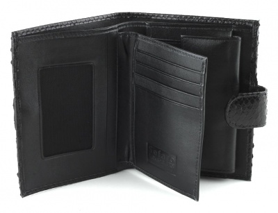 Портмоне мужское из кожи питона. Раскрывается на две створки, плюс одна откидная створка. Внутри два отделения для купюр, два потайных кармана под документы, карман на кнопке для мелочи, 8 карманов под визитные и кредитные карты, два кармана под сим-карты, окно для фотографии или документов. Кошелек закрывается на хлястик с магнитной кнопкой. Все детали внутренней отделки кошелька выполнены из высококачественной телячьей кожи.