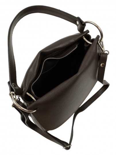 Сумочка имеет каркасную полужесткую форму, выполнена из телячьей кожи мягкой зернистой износостойкой выделки – надежной и прочной. В качестве изысканного украшения – большие металлические кольца и изысканные кисточки на молниях. Модель сочетается с вещами в стиле Casual, будет органично смотреться в классическом, деловом либо повседневном образах.